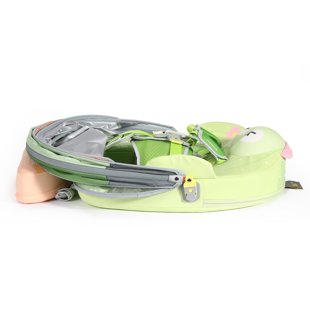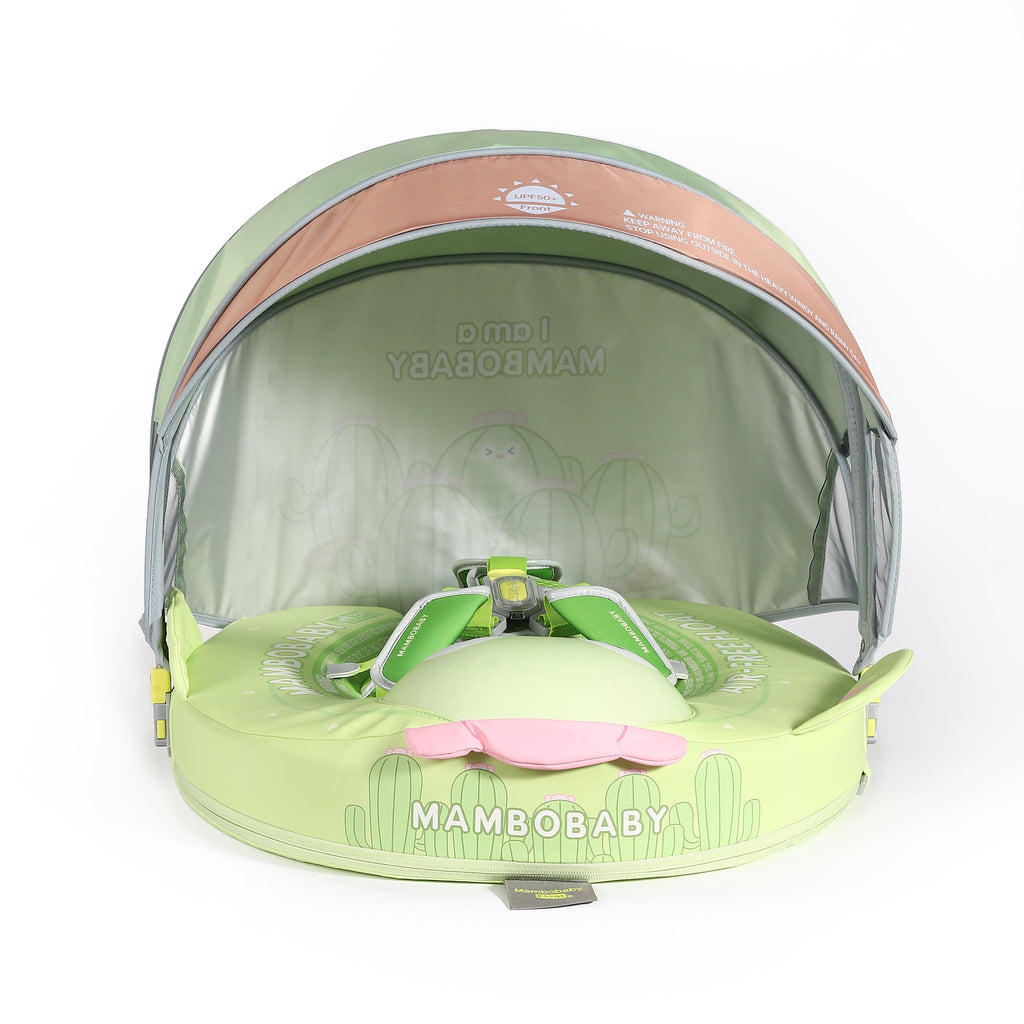 O flutuador vem com uma capota ajustável em 3D que oferece proteção solar FPS 50+. Esta capota inovadora oferece um ângulo de sombra estendido de 180 graus + 45 graus e possui armazenamento em uma única peça, oferecendo proteção completa contra os raios UV contrabaixo, mantendo seu bebê na sombra e ao ar livre.