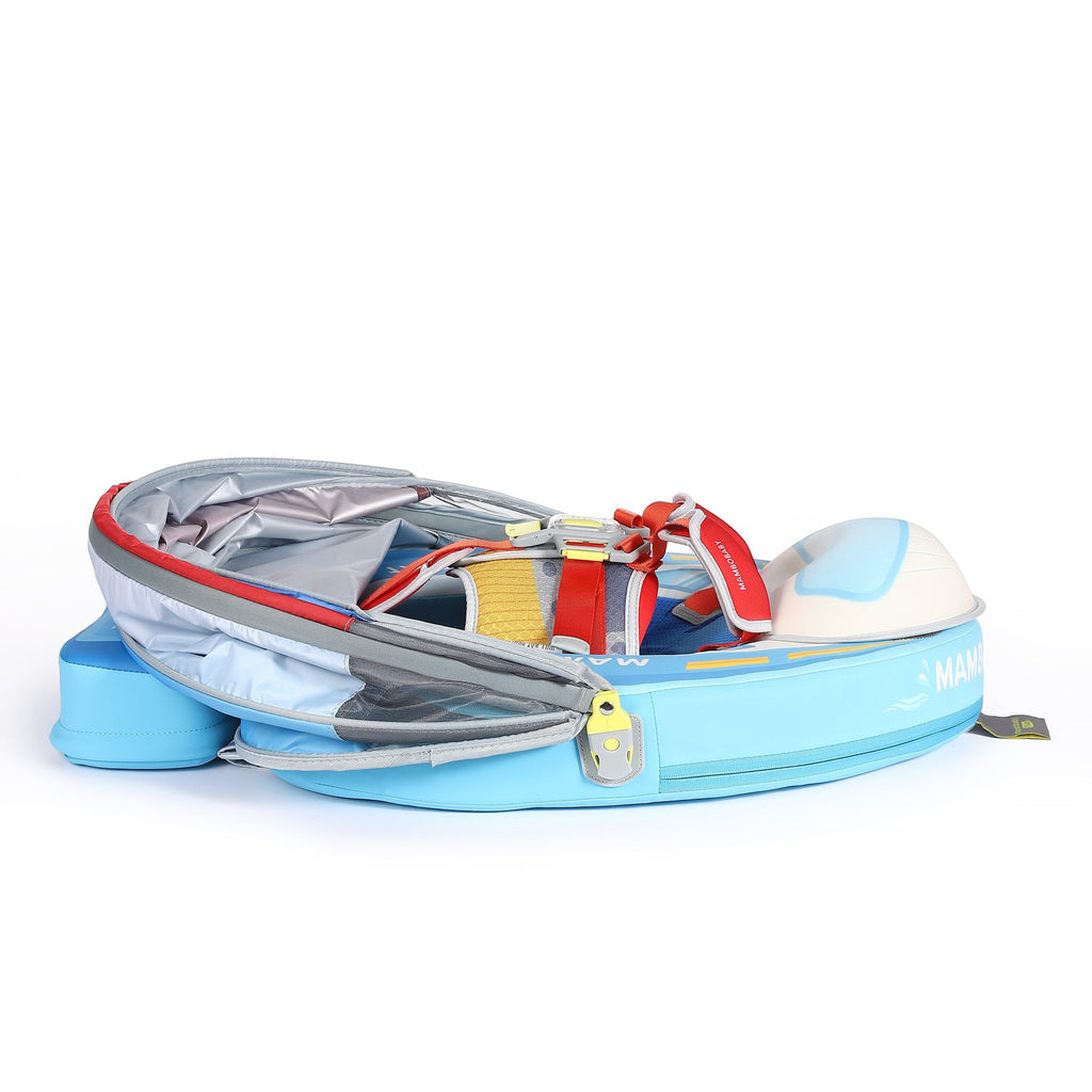 O flutuador vem com uma capota ajustável em 3D que oferece proteção solar FPS 50+. Esta capota inovadora oferece um ângulo de sombra estendido de 180 graus + 45 graus e possui armazenamento em uma única peça, oferecendo proteção completa contra os raios UV contrabaixo, mantendo seu bebê na sombra e ao ar livre.