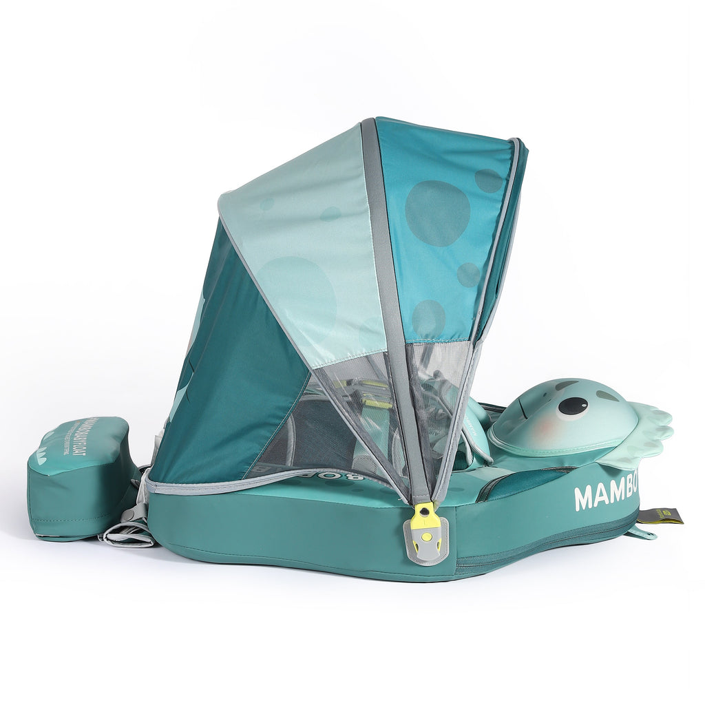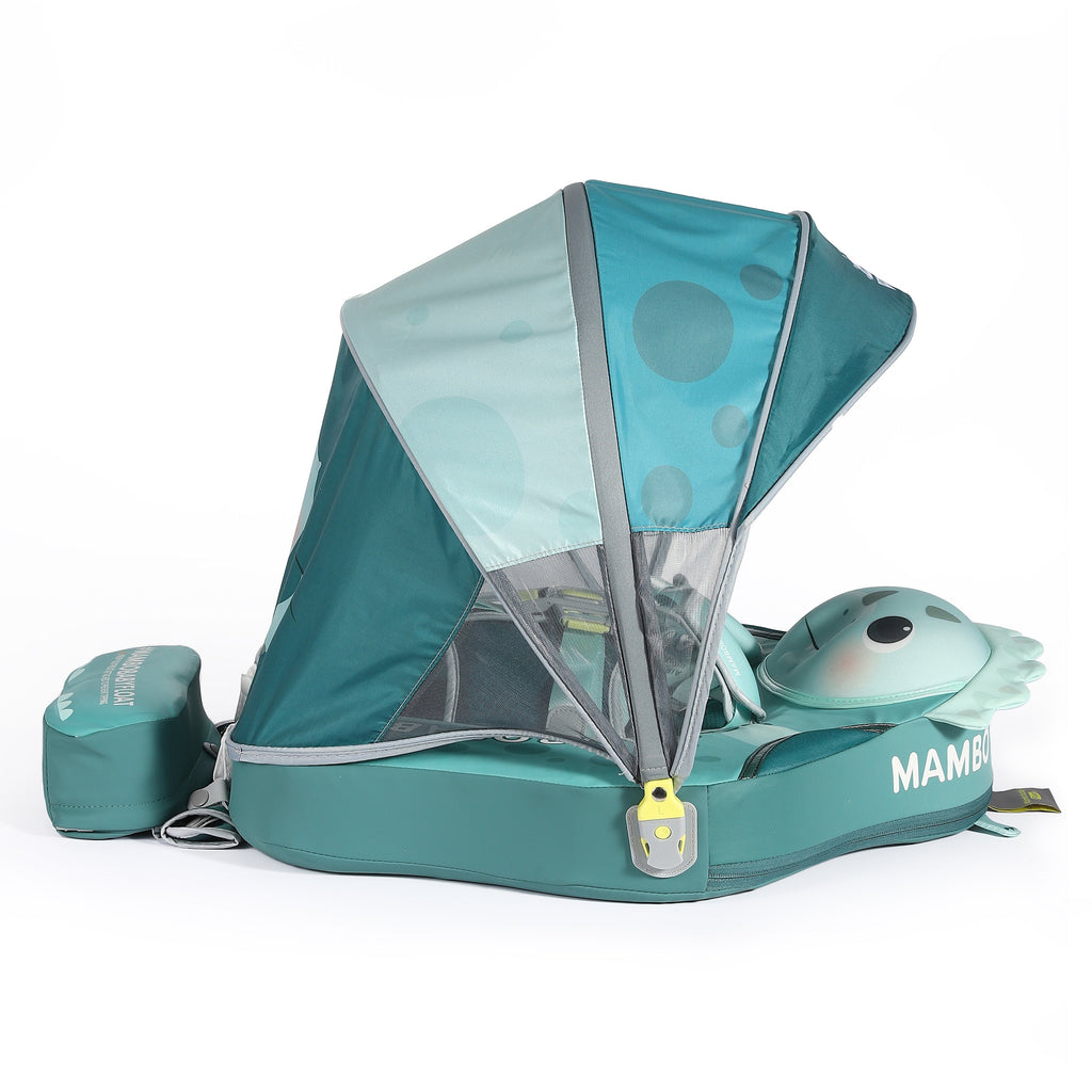 O flutuador vem com uma capota ajustável em 3D que oferece proteção solar FPS 50+. Esta capota inovadora oferece um ângulo de sombra estendido de 180 graus + 45 graus e possui armazenamento em uma única peça, oferecendo proteção completa contra os raios UV contrabaixo, mantendo seu bebê na sombra e ao ar livre.