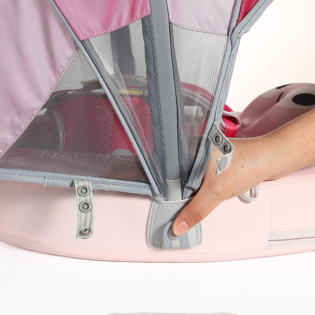 O flutuador vem com uma capota ajustável em 3D que oferece proteção solar FPS 50+. Esta capota inovadora oferece um ângulo de sombra estendido de 180 graus + 45 graus e possui armazenamento em uma única peça, oferecendo proteção completa contra os raios UV contrabaixo, mantendo seu bebê na sombra e ao ar livre.