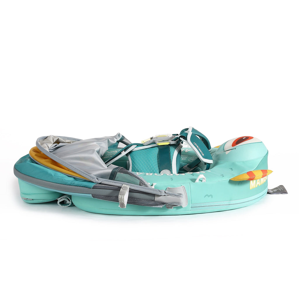 O flutuador vem com uma capota ajustável em 3D que oferece proteção solar FPS 50+. Esta capota inovadora oferece um ângulo de sombra estendido de 180 graus + 45 graus e possui armazenamento em uma única peça, oferecendo proteção completa contra os raios UV contrabaixo, mantendo seu bebê na sombra e ao ar livre.